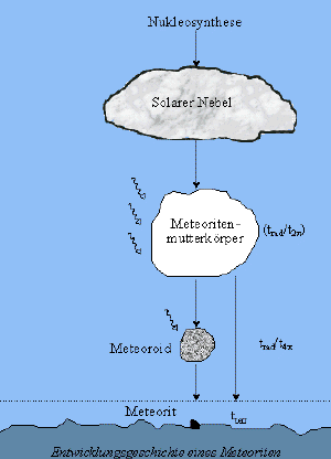 Meteorite bestehen, wie schon unter 'Ursprung der Meteorite' kurz angesprochen wurde, grundsätzlich aus derselben Materie wie der Rest des Sonnensystems. Die folgende Abbildung zeigt schematisch die Entwicklungsgeschichte eines Meteoriten. Die Bildung der chemischen Elemente verlief in verschiedensten Kernprozessen bei hohen Temperaturen und Drücken im Sterneninneren. Nach dieser Nukleosynthese gelangte die Materie in den interstellaren Raum, wo sie sich durch einen Gravitationskollaps zum solaren Nebel aus Gas und Staub verdichtete. Durch weitere Verdichtung und Zusammenballung entstanden erst kleinere (Planetisimale), dann schließlich größere Körper, die Meteoritenmutterkörper (Asteroide und Planeten).